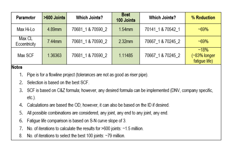 | joints to improve further the hi-lo and SCF if desired; regardless, it is always best practice to use the best pipe joints for the project or group the joints as per criticality of use |